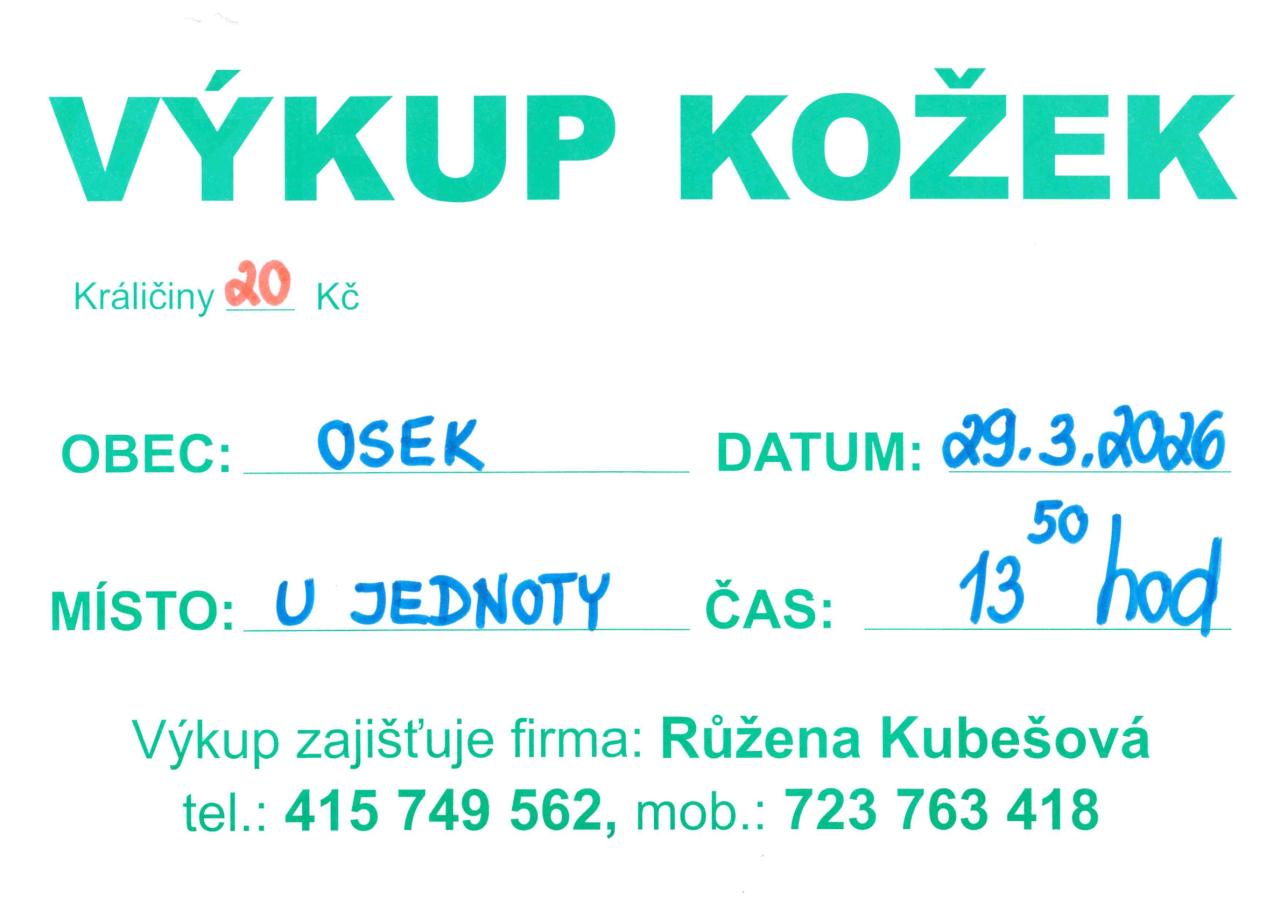 Výkup kožek v Oseku dne 29. 3. 2026 od 13,50 hodin u prodejny COOP.